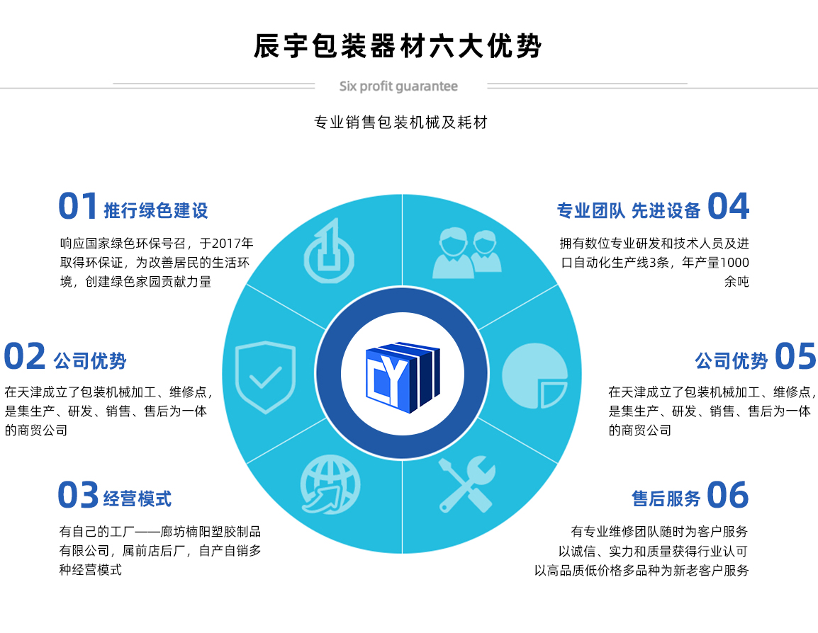 天津辰宇包裝器材有限公司原天津市辰宇商貿有限公司,位于天津市南開區密云一支路新南馬路五金城二區33棟106號,本公司主要經營:打包帶,打包機系列,封箱機系列,纏繞機系列,拉伸膜,膠帶,尼龍繩,其他包裝耗材等產品 公司產品質優(yōu)價廉,暢銷全國各大城市。同等質量比價格,同等價格比質量,我們確保質量,價錢合理,交貨迅速及時。公司始終秉承“精益求精,鑄造品質的典范”的經營理念,真誠為廣大客戶提供真誠的服務! 天津市辰宇包裝器材有限公司,感謝廣大新老客戶的鼎力支持,竭誠歡迎社會各界朋友前來洽談業務,愿真誠合作攜手共創(chuàng)美好未來!